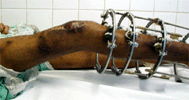 Knee flexion corrected with tibia frame applied